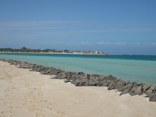 Nous arrivons à Coral Bay, il n'y a qu'une seule rue et ce n'est que des campings et des hôtels! On se dit que ce village est très touristique (de plus c'est les vacances scolaires!) mais lorsque l'on voit la plage, on découvre une baie exceptionnelle avec une eau superbe qui fait un dégradé de bleu jusqu'à la barrière de corail.