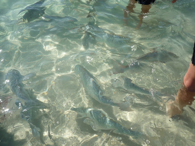 Dans l'après midi, ils donnent à manger aux snappers (poissons de 80cm), très peu peureux, ils nagent entre nos jambes !