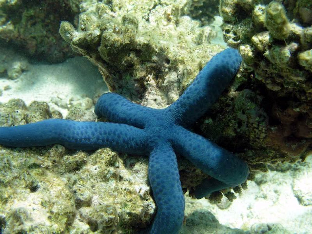 Nous allons sur une autre plage pour plonger avec nos masques et tubas. C'est superbe on voit une grosse étoile de mer bleue,