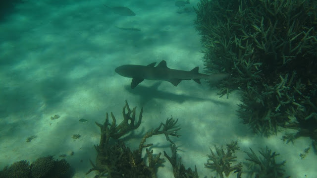 on passe devant le sanctuaire de requins où une 10aine de petits requins noirs nagent tranquillement. On essaye de les approcher (car ils sont évidemment inoffensifs) mais un peu peureux.